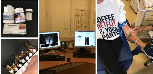 De medicatie vind ik best wel heftig. Ik slik 1x in de week een hoge dosis methotrexaat waarvan ik me behoorlijk ziek en energieloos voel de dag erna. De methotrexaat is niet goed voor je nieren en breekt je foliumzuur af, hierdoor moet ik ook 2x per week foliumzuur slikken en ben ik door de bijwerkingen mijn enorme bos krullen kwijt (mijn haar is veel dunner en stijl geworden) waar ik erg verdrietig over ben. Ook slik ik elke dag prednison, deze is weer slecht voor je botten waardoor ik ook een hoge dosis Calcium en Vitamine D moet slikken en snel blauwe plekken krijg en dan heb ik het nog niet eens over de bijwerkingen. Je begrijpt natuurlijk wel dat als je medicatie slikt en voor de negatieve effecten van die medicatie ook weer extra pillen krijgt, je dan wel regelmatig op controle moet.