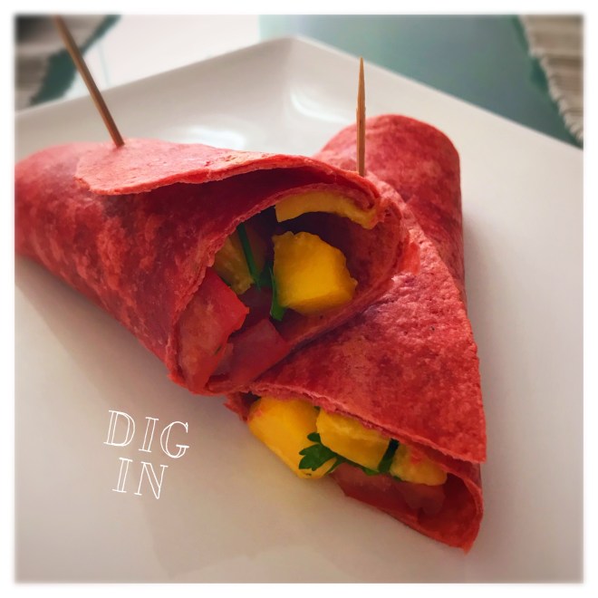 - Leg een wrap op je bord en vul deze met de mango, koriander en tomaten en rol hem op!