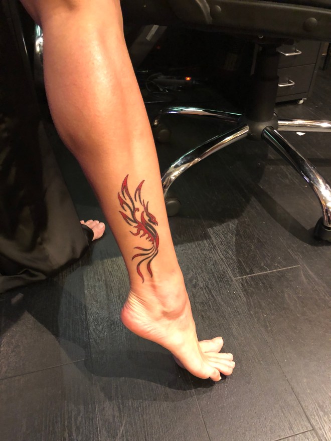 Ik wilde deze laatste tattoo op mijn enkel nog heel graag en was er onwijs blij mee. Een feniks…waar rode inkt in zit. Na een paar dagen leek het erop dat een stukje van de wond maar niet wilde helen en op de plekken waar rode inkt zit bleef het ook rood en pijnlijk eromheen. Ik dacht dat het wel meeviel, omdat elke tattoo weer anders is en deze ook wel op een gevoelige plek zat. Tot ik na een week wel heel erg veel pijn begon te ervaren en bijna niet meer kon lopen. Nadat ik mijn broek een stukje omhoog deed en dit zag… begon ik me toch wel erge zorgen te maken en te vermoeden dat er iets meer aan de hand was.