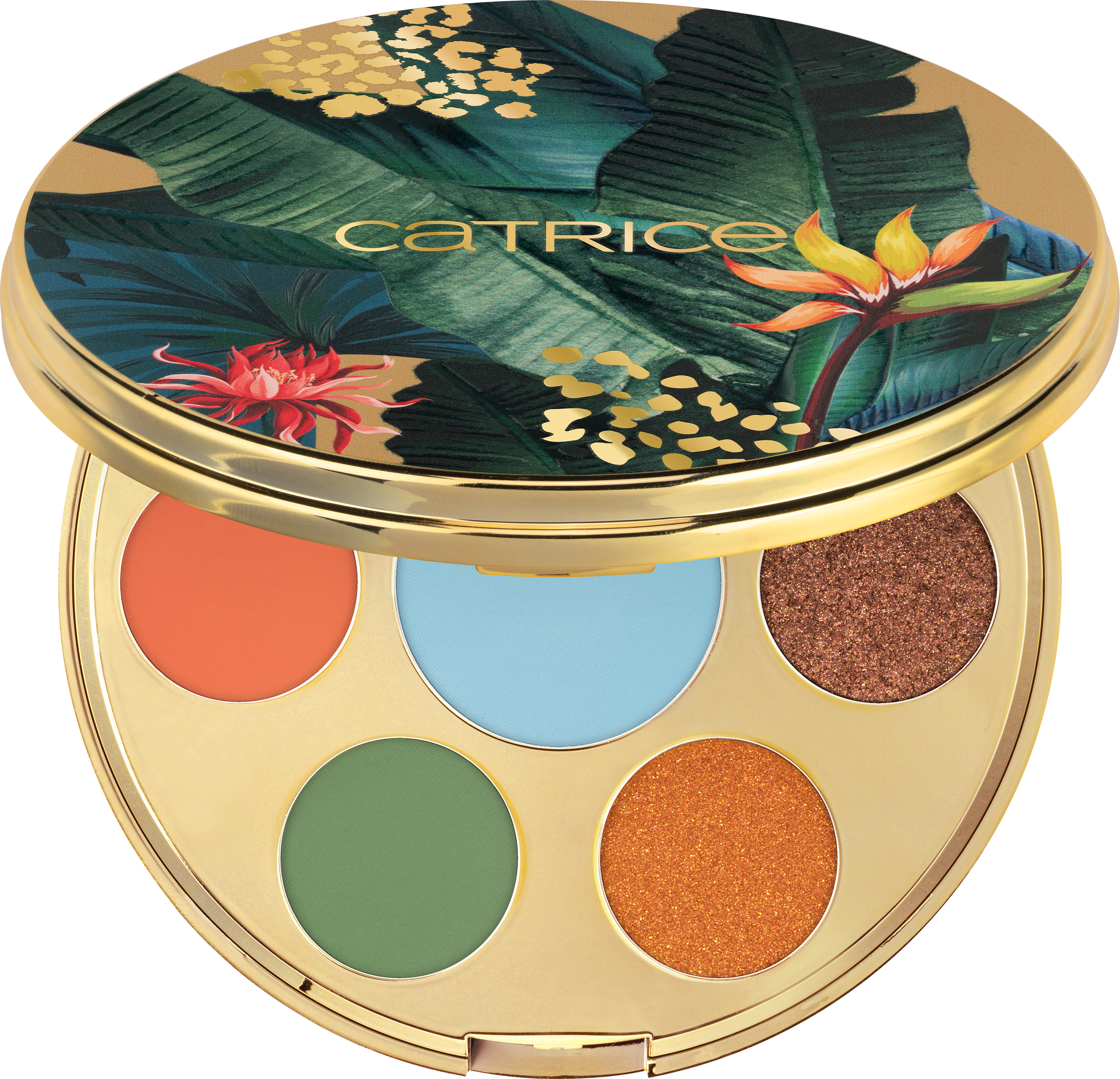 Into the wild! Het CATRICE WILD ESCAPE oogschaduwpalet is een echte blikvanger met zijn exotische ontwerp en geïntegreerde spiegeltje. Groene palmbladeren, gouden applicaties en exotische bloemen op de bovenzijde doen denken aan een tropische wildernis. Het palet biedt zeven unieke, harmonieuze trendkleuren: nudes en goudtinten, intens terracotta, blauw en groen bieden zowel matte als glanzende finishes.